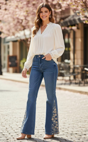 Stylish, flattering, and uniquely detailed—these high-rise flare jeans feature delicate embroidered side panels that add elegance and charm to a classic light-blue denim look. Made with soft, stretchable fabric for all-day comfort, they pair effortlessly with any top for a chic, feminine style. A beautiful blend of craftsmanship and modern fashion.