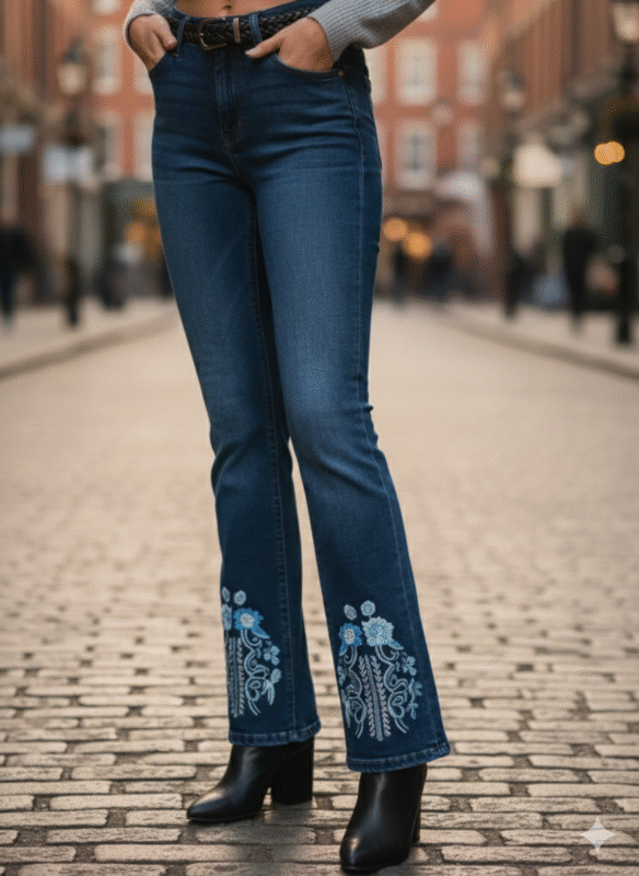 A perfect blend of classic denim and modern artistry, these dark-wash flare jeans feature beautifully stitched blue floral embroidery on the front hem and subtle detailing on the back pockets. Crafted from premium stretch denim, they offer a sleek, flattering fit with all-day comfort. Stylish, feminine, and effortlessly chic—your new go-to statement pair.