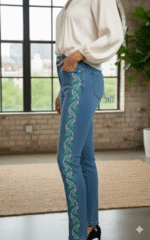 Elegant and refined, these medium-wash straight jeans feature a beautifully stitched thin side panel in shades of green and white, adding a fresh, sophisticated touch to a classic silhouette. Made with soft stretch denim and a flattering high-rise fit, they offer comfort, style, and a unique artisan detail that elevates any outfit.